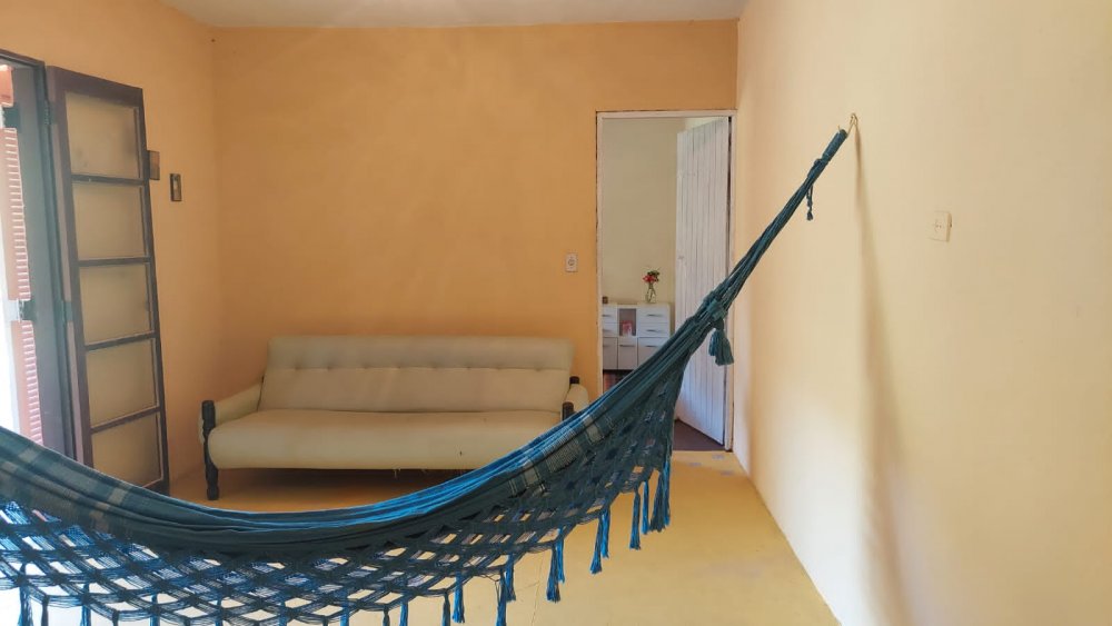Casa sede com sala, dois quartos, cozinha, dois banheiros e uma varanda.